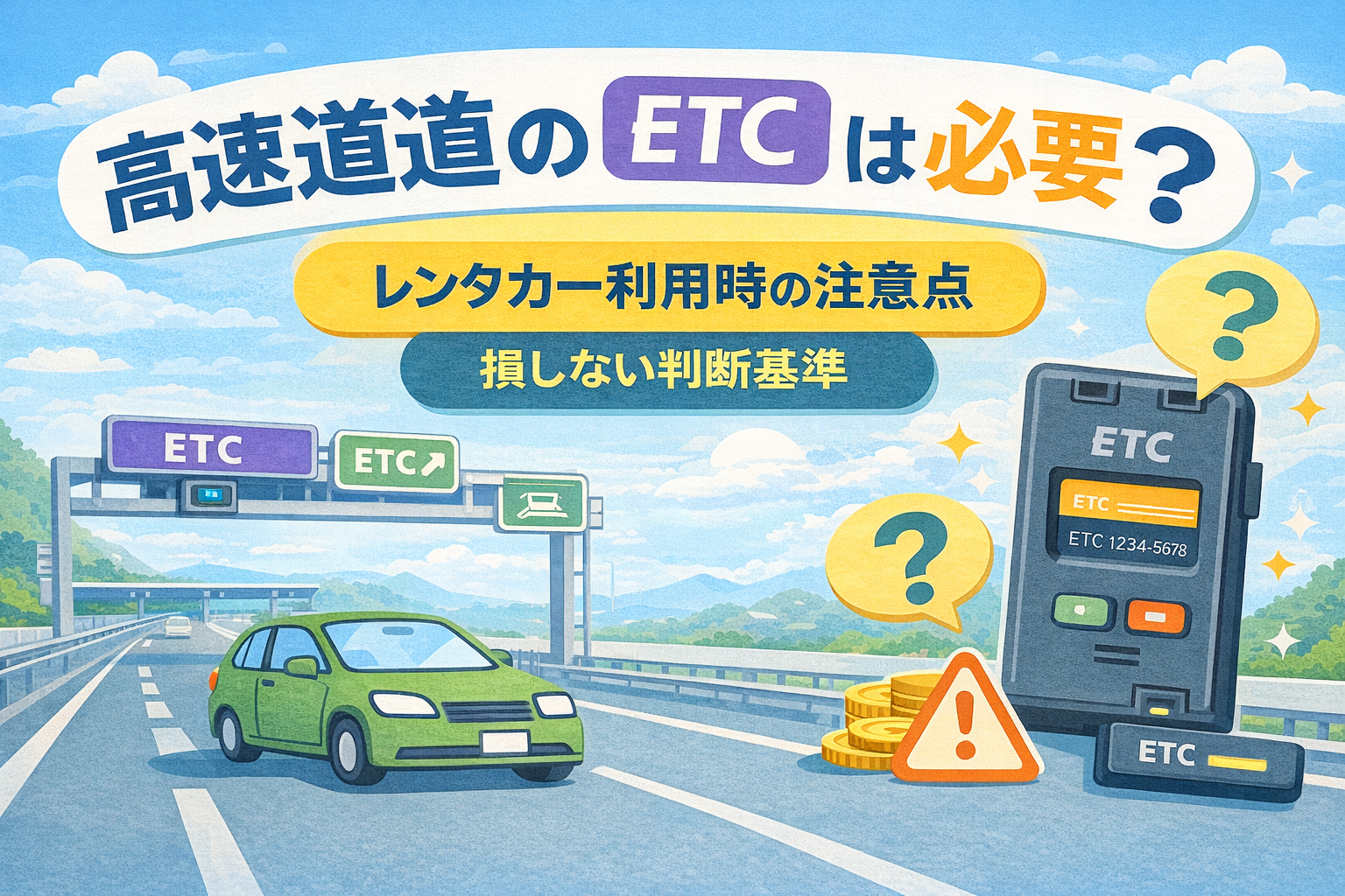 ETCが必要なケース/不要なケース、レンタカーでのETCの仕組み、注意点 をまとめます。